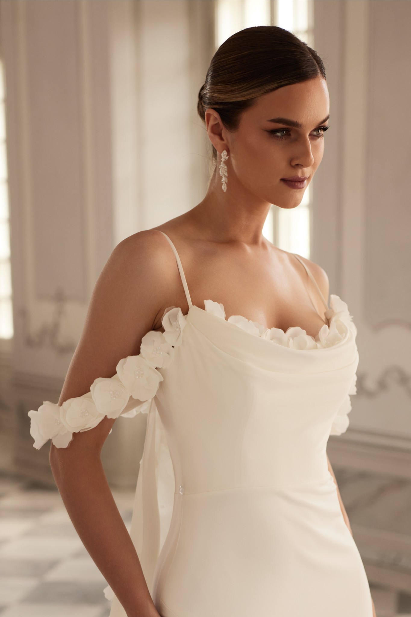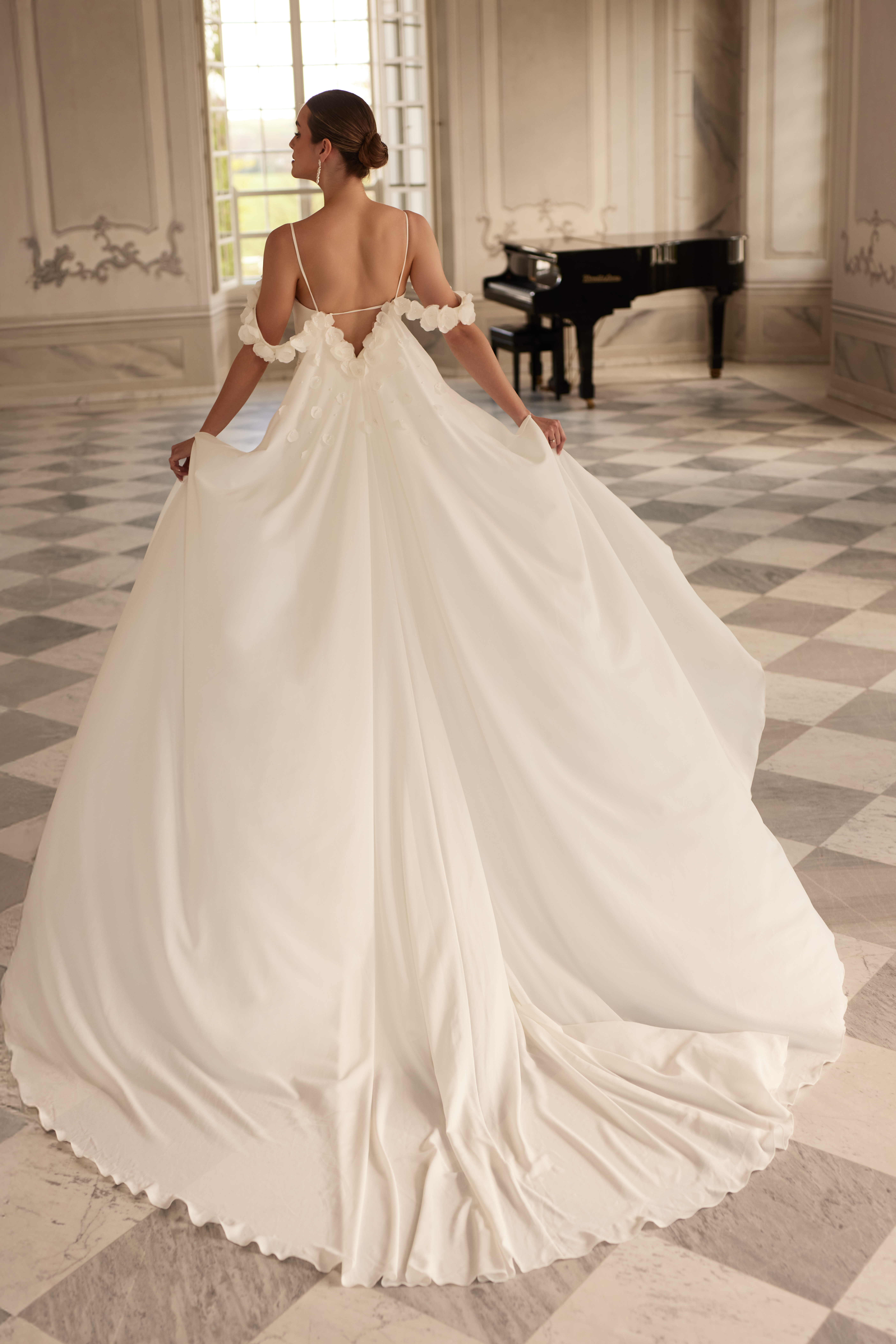 Suknia dostępna jest również w wersji z kwiatowymi rękawkami oraz dopinanym trenem.