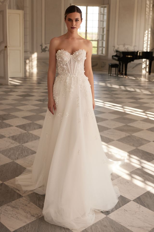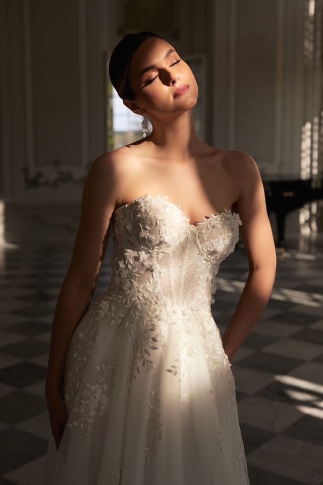 Gorset o subtelnym dekolcie serduszko pięknie eksponuje ramiona, a aplikacje schodzą na spódnicę drobnymi srebrnymi i białymi gałązkami oraz kwiatkami 3D.